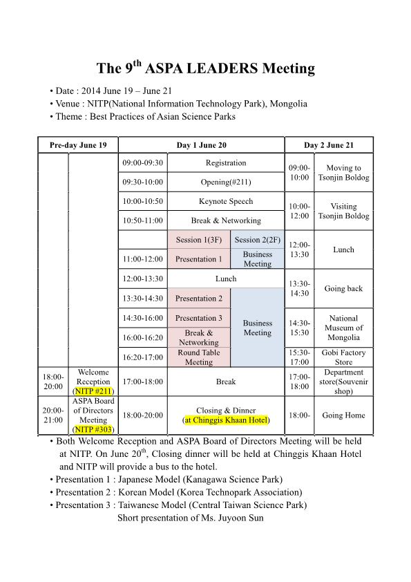 This meeting provides various programs so that members of ASPA can exchange information about their experience while enjoying beautiful nature with fresh air as well as nomadic culture in Mongolia. Besides, this is a great opportunity for participants to meet and exchange information with business entrepreneurs from STPs in Asian countries.